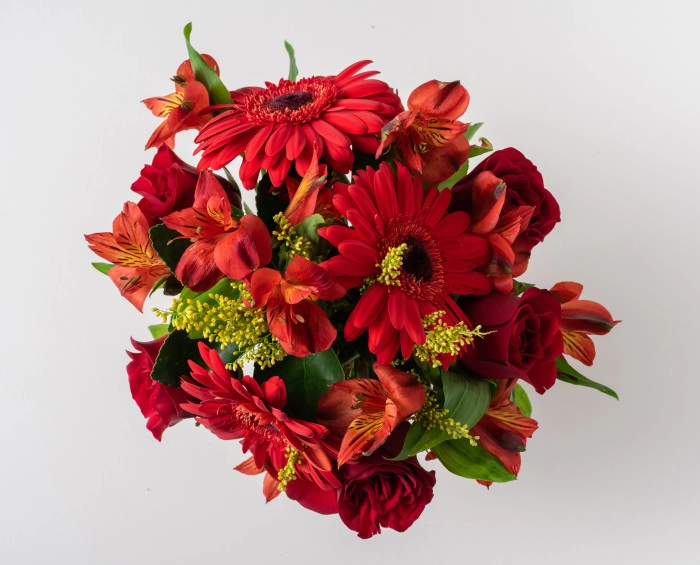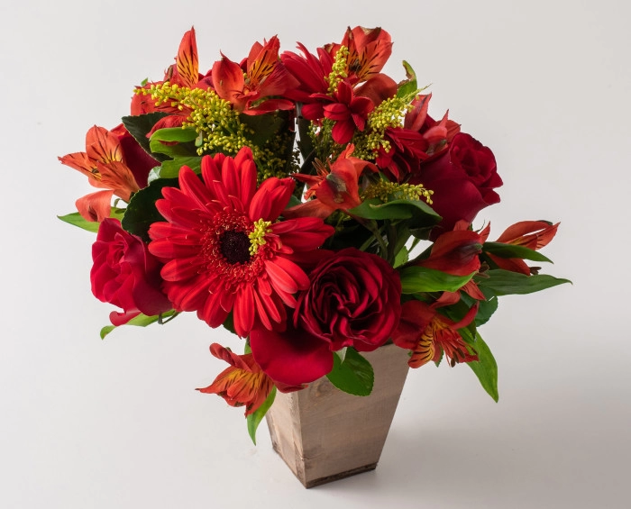 Flores mistas de cor vermelha chamam atenção. Esse arranjo, confeccionado com gerberas, rosas e astromélias, é perfeito para oferecer de presente, principalmente porque vem em um cachepot e companhado por deliciosos bombons.