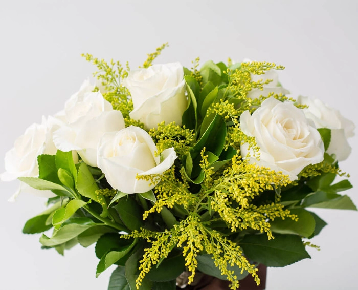 Na cor branca, a rosa remete à passividade e inocência. Esse buquê é entregue, sobretudo, em sinal de respeito. Com ruscus, tango e ráfia, a composição fica ainda mais elegante.