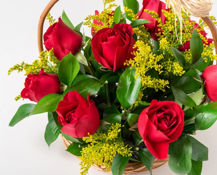 Uma bela cesta de flores feita com nove rosas vermelhas é perfeito para demonstrar o seu amor a uma pessoa muito especial. Para enaltecer esse sentimento, ela vem com chocolates e uma garrafa de espumante.