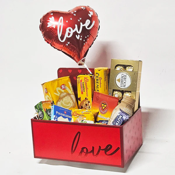 A Cesta Presente Matinal com Balão Love é cuidadosamente decorada e embalada para proporcionar uma surpresa encantadora para a pessoa presenteada.
